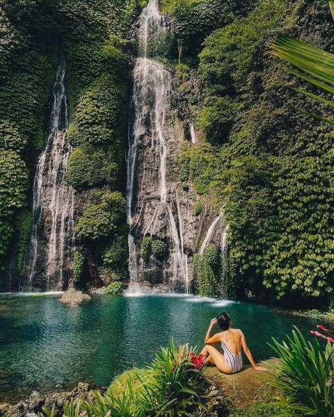 After enjoying the atmosphere and taking pictures on the wanagiri hill. Banyumala Waterfall is the next destination for our Bali Instagram tour. Banyumala Waterfall has three streams of waterfalls. So that the name of this waterfall tourist attraction is also called Banyumala Twin Waterfall.